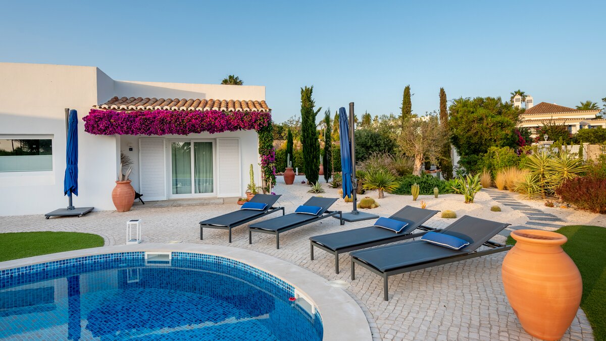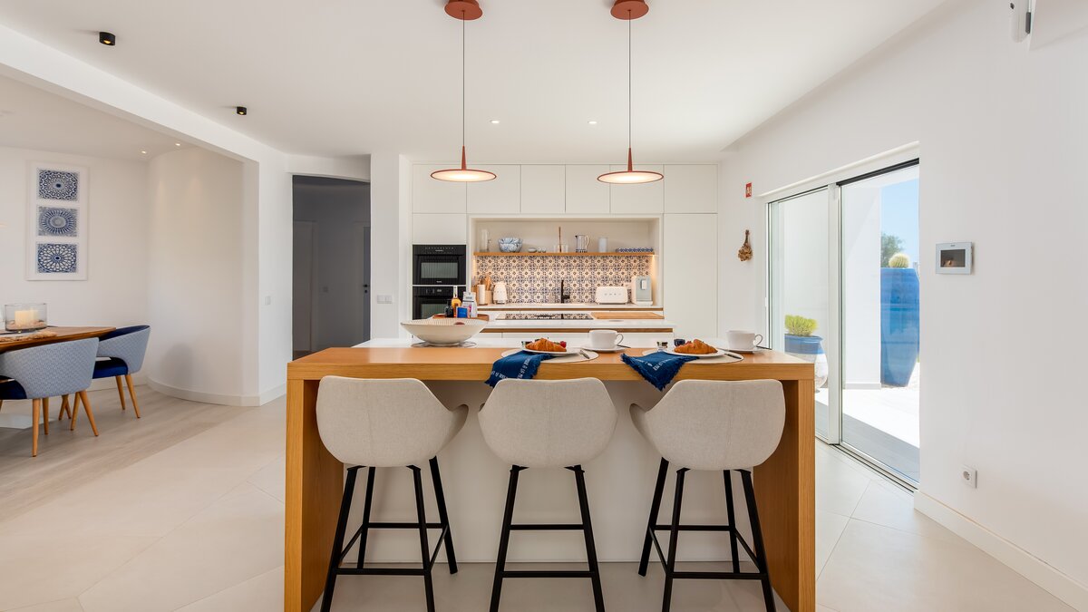 Treten Sie ein und entdecken Sie die geräumigen, lichtdurchfluteten Innenräume, in denen natürliche Materialien und beruhigende Farbtöne die Schönheit der umliegenden Landschaft hervorrufen. Deren Doppelinselküche der Villa und der angrenzende Essbereich fügen sich nahtlos in eine einladende Hauptlounge und ein intimeres Wohnzimmer ein, das sowohl Gemeinschafts- und auch Privaträume bietet. Vier Schlafzimmer mit eigenem Bad, die jeweils nach den Stränden der Region benannt sind (Praia Luz, Paraïso, Falesia, Rocha), sind individuell in beruhigenden Blau-, Türkis- und Ockertönen eingerichtet und bieten entweder Meer- oder Poolblick oder eine abgeschiedene Terrasse. Sorgfältig ausgewählte Möbel, hochwertige Bettwäsche und historische portugiesische Azulejos verleihen dem gesamten Gebäude einen Hauch von Tradition und Komfort und sorgen für ein gemütliches und dennoch anspruchsvolles Ambiente.