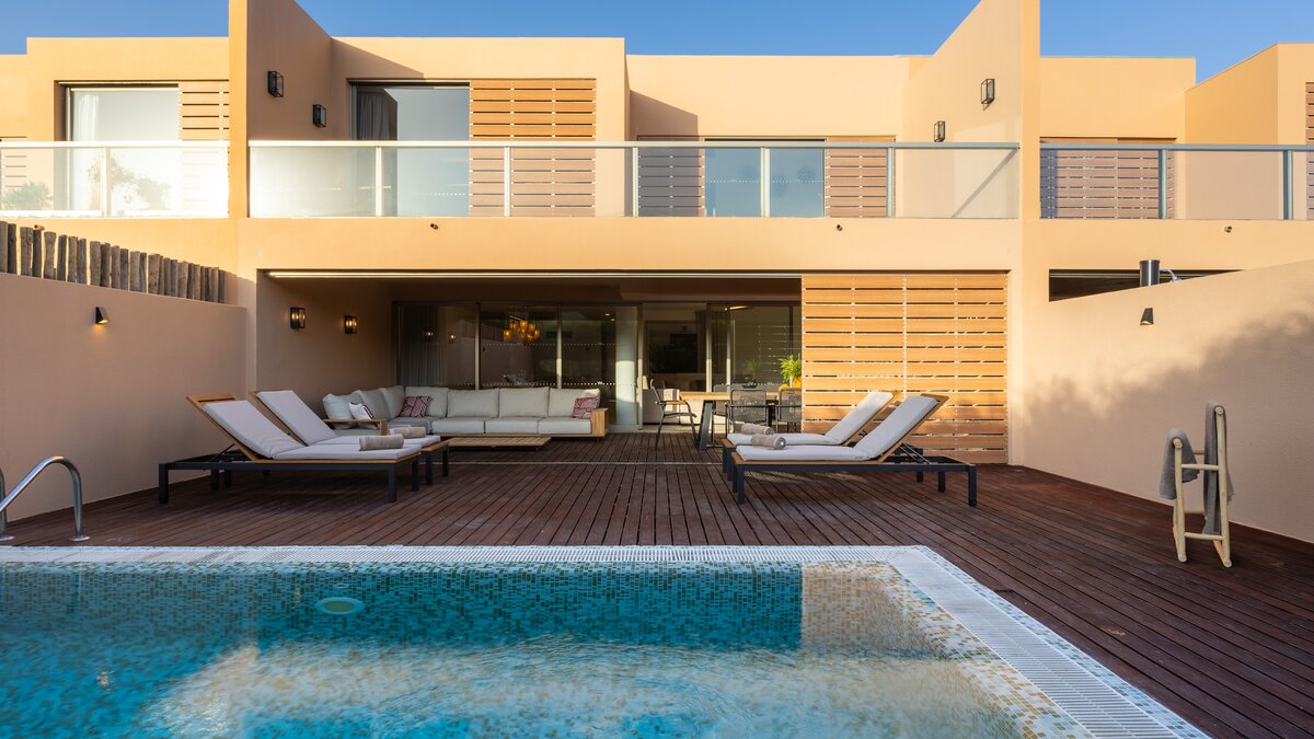 Im Freien wird der private 5 x 3 m große Pool von einer eleganten Holzterrasse eingerahmt, die von Liegestühlen umgeben ist und einen ruhigen Ort zum Sonnenbaden schafft. Eines Auswahl an Bars und Restaurants ist nur 400 M vom Vidamar Resort entfernt, während der Golfplatz Salgados 300 m von der Villa entfernt ist und die charmante Stadt Gale 2,1 km entfernt ist. Den Yachthafen von Albufeira und die langen goldenen Strände der Algarve sind ebenfalls leicht zu erreichen.