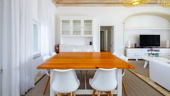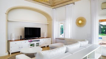 Diese Familienvilla ist in den traditionellen portugiesischen Farben hellblau und weiß gehalten und befindet sich in idealer Lage in Gehweite zu den nahe gelegenen Geschäften und Restaurants im malerischen Fischerort Olhos d’agua. Dessen Innere ist geschmackvoll mit kalkweißen Wänden und weichen Möbeln auf kühlen Marmorböden eingerichtet. Der große Innen-Esstisch ist ideal für ein offenes Wohnen konzipiert und teilt sich viel Platz mit einer bequemen Sitzgruppe und einem großen Fernseher unter hohen Gewölbedecken. Eine moderne Küche mit einem kleinen Frühstückstisch und Blick auf die Terrasse, während drei helle und luftige Schlafzimmer mit eigenem Bad das Anwesen vervollständigen.