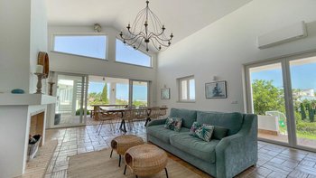 Im Inneren ist die Villa hell und luftig, mit offenem Wohnraum gestaltet, um das Beste aus dem Blick auf das Meer zu machen. Dessen Erdgeschoss fließt von einer einladenden Eingangshalle in einen geselligen Raum zum gemeinsamen Kochen, Essen und Entspannen, mit breiten Glastüren, die den Blick auf die Poolterrasse lenken. Drei Schlafzimmer befinden sich auf dieser Ebene: ein Doppelschlafzimmer mit Bad en suite und zwei weitere Doppelschlafzimmer mit Dusche en suite. Ein separates Duschbad vervollständigt diese Etage und sorgt für müheloses Urlaubsleben für Familien.