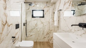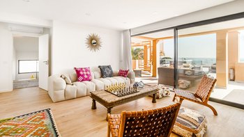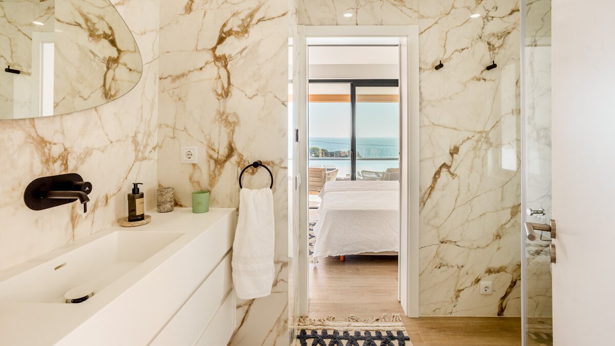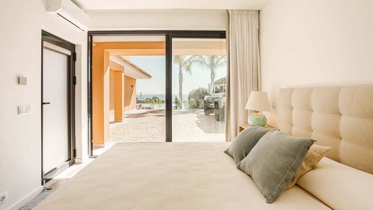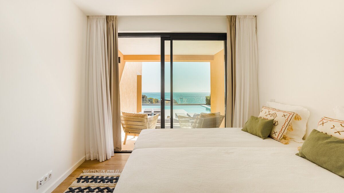 Im Obergeschoss verfügt die Villa über zwei weitere schön eingerichtete Schlafzimmer, jedes wiederum mit eigenem Bad, um Privatsphäre und Komfort für jeden Gast zu gewährleisten. Sie haben direkten Zugang zu einem privaten Balkon, von dem aus Sie mit Panoramablick auf das Meer aufwachen oder einen ruhigen Moment bei Sonnenuntergang genießen können. Denen Einrichtung ist modern und doch einladend, mit einem Schwerpunkt auf natürlichem Licht und beruhigenden Farbtönen, die die Küstenlandschaft widerspiegeln.