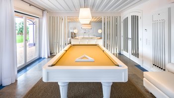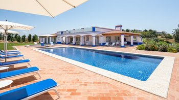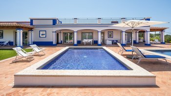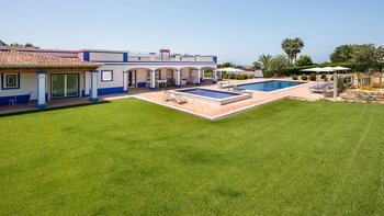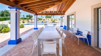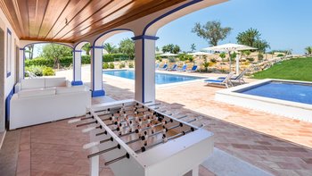 Der Wohnbereich und mehrere Schlafzimmer öffnen sich auf die schattige Terrasse, die bequem zum Entspannen und Essen eingerichtet ist, mit Blick auf die flachen, mit Rasen bepflanzten Kiesbeeten mit Bäumen und Sträuchern gesäumten Gärten. Des Herzstück des Gartens ist der große private Pool, der in der sonnigen Terrasse versenkt ist, und das zugehörige Kinderbecken angrenzend. Perfekt für Familien mit Kindern, die Kleinen werden auch Tischfußball, Tischtennis und Playstation lieben. Denen Strände von Vilamoura sind 15 km Autofahrt entfernt, während Boliqueime nur 4 km von der Villa entfernt ist.