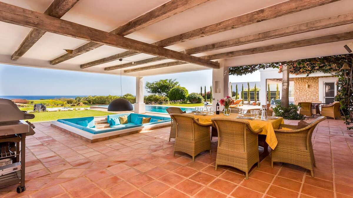 Im Obergeschoss beeindruckt die Villa weiterhin mit einem großzügigen, OFFENER GRUNDRISS Wohnraum, der für gesellige Momente und Familienfeiern konzipiert ist. Deren raumhohe Fenster lassen viel Tageslicht herein und bieten einen Panoramablick auf das Meer, während der angrenzende Essbereich und die stilvolle Lounge eine entspannte und dennoch elegante Atmosphäre schaffen. Ebenfalls auf dieser Etage befinden sich zwei weitere Schlafzimmer mit Doppelbett, beide mit Kingsize-Bett und eigenem Bad ausgestattet. Deren Hauptschlafzimmer verfügt über einen umlaufenden Balkon, der den idealen Ort für morgendliches Yoga oder einen Sundowner mit Aussicht bietet.
