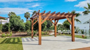 Der schön angelegte Garten umgibt einen einladenden beheizten Pool, wo die Gäste erfrischende Bäder nehmen können, während sie die Sonne tanken. Bequeme Liegestühle und schattige Sitzbereiche sind durchdacht angeordnet, um idyllische Orte für Entspannung und Freizeit zu bieten. Ein Außenbereich mit Gasgrill und Außenwaschbecken bietet den perfekten Rahmen, um unvergessliche Mahlzeiten zuzubereiten.