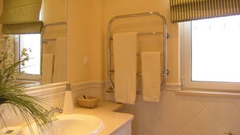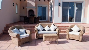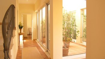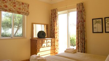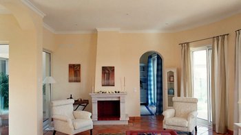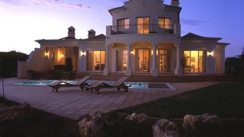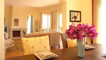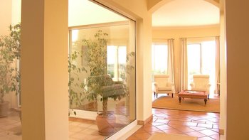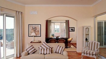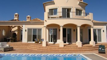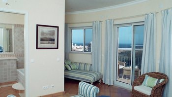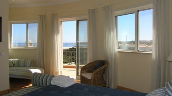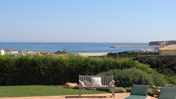 Diese hübsche rosafarbene Villa bietet einen herrlichen Blick auf das Meer und die nahe gelegene Küstenstadt Sagres.