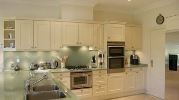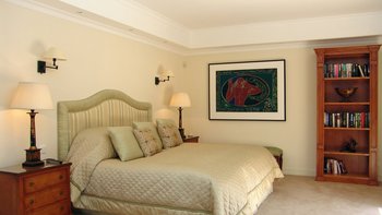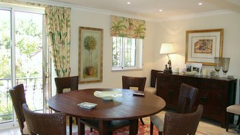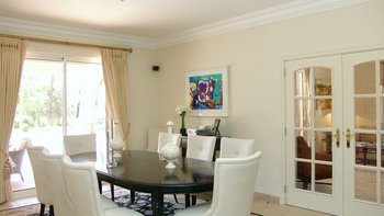 Im Erdgeschoss befinden sich ein Wohnzimmer, ein Esszimmer und eine Küche. Dessen Wohnzimmer ist hell, aber gemütlich, mit einem Kamin und vielen weichen Sitzgelegenheiten, in diesem Raum gibt es auch einen informelleren Ort zum Essen, wenn die Gäste dies wünschen. Dessen Esszimmer ist eher formell, mit französischen Türen, die auf die Terrasse führen. Deren Küche ist komplett ausgestattet, mit viel Platz auf der Arbeitsplatte. Auf dieser Etage befinden sich auch zwei Doppelschlafzimmer mit Bad en suite, von denen eines einen privaten Zugang zur Poolterrasse hat.