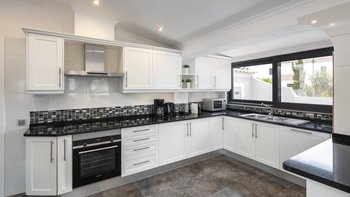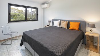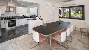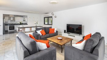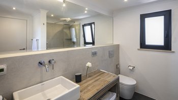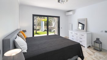 Die Villa Dulce verbindet auf wunderschöne Weise Eleganz mit Funktionalität in ihren weitläufigen Wohnräumen. Deren untere Bereich ist ein Beweis für anspruchsvolles Design und verfügt über ein geräumiges Wohnzimmer mit bequemen Sitzgelegenheiten und modernem Dekor. Große Fenster tauchen den Raum in natürliches Licht und bieten einen malerischen Blick auf den Garten. An diesen einladenden Raum grenzt eine offene Küche an, die komplett mit modernsten Geräten und großzügigen Arbeitsflächen ausgestattet ist. Der Essbereich mit Blick auf den Garten bietet einen perfekten Rahmen für Abendessen in intimer Atmosphäre oder unterhaltsame Gäste. Auf dieser Ebene bieten drei Doppelschlafzimmer Komfort und Privatsphäre. Ein Schlafzimmer verfügt über ein eigenes Duschbad, während sich die anderen beiden ein stilvolles Duschbad teilen, was die Villa zu einer idealen Wahl für Familien mit mehreren Generationen macht.