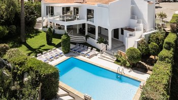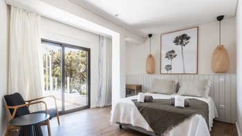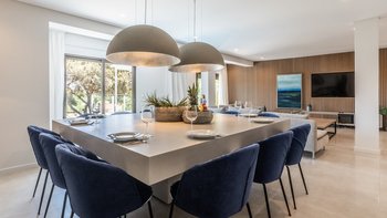 Die Innenräume der Villa sind ein Meisterwerk des zeitgenössischen Designs und zeichnen sich durch eine moderne Ästhetik aus, die Komfort und Raffinesse nahtlos verbindet. Creme- und Pastelltöne schaffen eine ruhige Atmosphäre, die durch ein schickes Dekor und eine elegante Einrichtung ergänzt wird. Der geräumige offene Wohnbereich verfügt über große, einladende Sofas und einen weitläufigen Essbereich, der mühelos auf die Außenterrasse übergeht. Jedes der fünf Schlafzimmer mit eigenem Bad wurde sorgfältig gestaltet, um maximalen Komfort zu bieten, mit vier Doppelzimmern und einem Zweibettzimmer, die viel Platz und Privatsphäre für die Gäste bieten.
