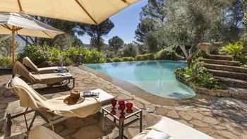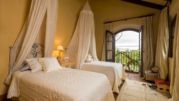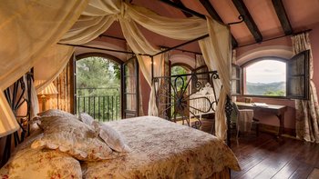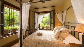 Eines der fünf Schlafzimmer, die Master-Suite verfügt über ein Himmelbett und ein großes Bad en suite. Und draußen gibt es überdachte Terrassen, die zum Entspannen und Essen eingerichtet sind, einen charmanten Innenhof, weitläufige Gärten mit Rasen und Bäumen und einen Freiform-Infinity-Pool in Waldlandschaft mit gepflasterter Terrasse und Pavillon-Bar am Pool. La Casa Roja liegt in ruhiger Abgeschiedenheit 11 km von Casares und 14,5 km vom historischen und malerischen Gaucin entfernt.