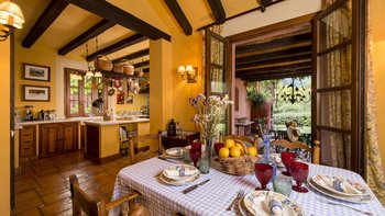 Dieses bezaubernde Haus wurde entworfen, um die Handwerkskunst, den Stil und die Materialien andalusischer Landgüter aus dem 18. Jahrhundert zu zelebrieren. Es verfügt über vier Flügel, die ein Kreuz mit einem achteckigen Turm in seinem Kern bilden und einen 360-Grad-Blick auf die Berge und das Flusstal bieten. Denen mit großer Sorgfalt angelegten Böden der Villa bestehen aus Tropenhölzern, gebrannten Lehmfliesen und Flusskieseln; die Wände sind kalkgewaschen; das Dach bilden wiedergewonnene maurische Dachziegel und riesige Türen wurden aus den Ruinen alter Anwesen gerettet und renoviert. Zu den einladenden sozialen Räumen gehören ein Wohnzimmer mit Holzbalken mit einem großen Holzkamin, ein ähnlich traditionelles Esszimmer und eine rustikale Frühstücksküche mit Herd.