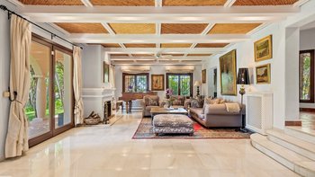 Fast versteckt in ruhigen und tropischen Gärten, wo hoch aufragende Palmen aus gepflegten Rasenflächen emporragen, bringt diese spektakuläre Familienvilla in Andalusien mehr als einen Hauch von Bali nach Puerto Banus.