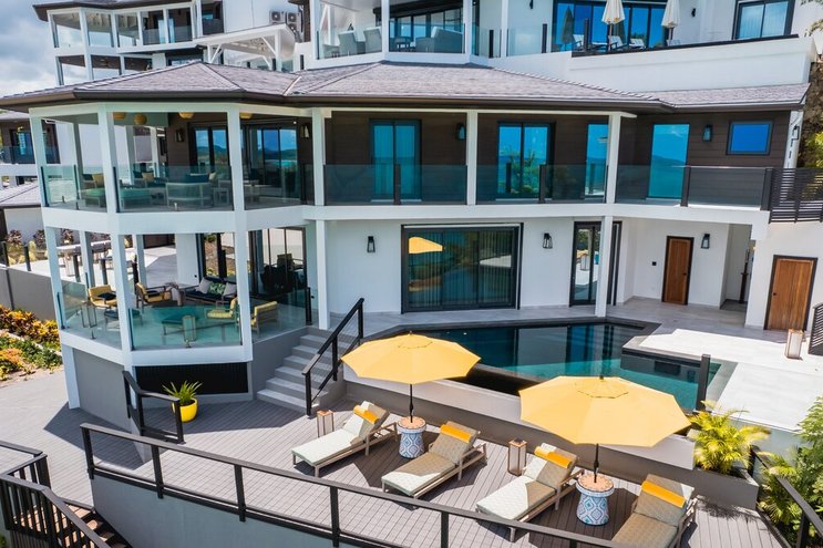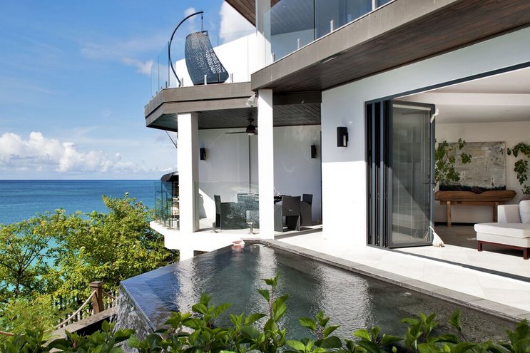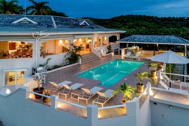 Diese opulente Villa mit fünf Schlafzimmern befindet sich direkt an der Spitze von Antigua und bietet Panoramablick auf das Meer und exquisites Design.