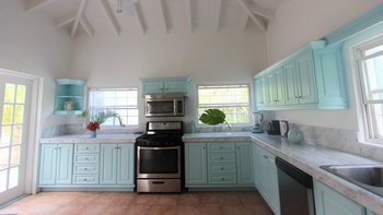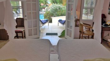 Zwischen Palmen thront ein charmantes Häuschen auf dem Grundstück, Bildkarte gelb gemalt mit blauen Fensterläden. Ein Schlafzimmer mit Bad und Dusche en suite ist hier verschachtelt.
