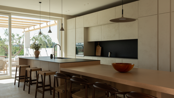 Outside, a shaded pergola invites alfresco dining, while the infinity pool opens onto sweeping views of olive groves, orchards, and dry-stone walls stretching across the countryside. The low-impact garden, designed by award-winning Studio Paz, combines native plants and sculptural stone paths, reflecting the rhythms of the land.