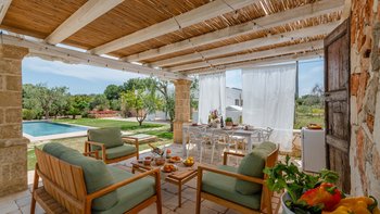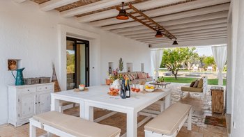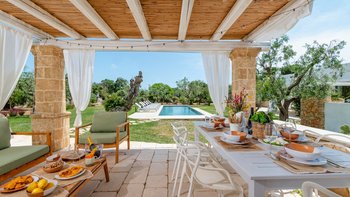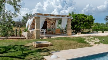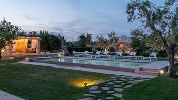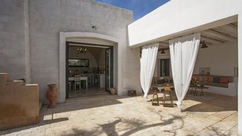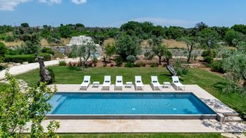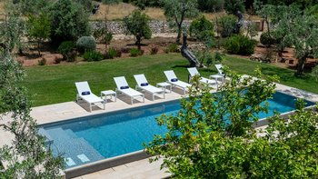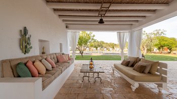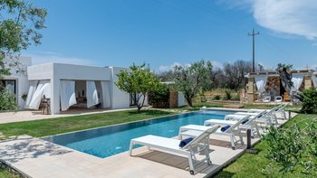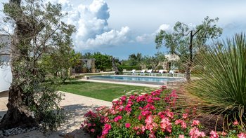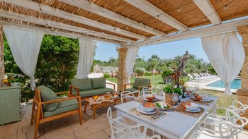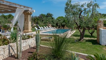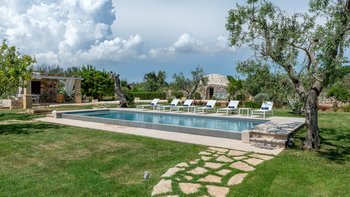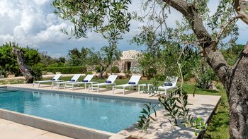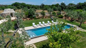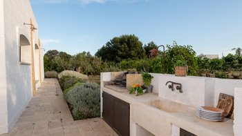 Umgeben von weitläufigen Gärten und Olivenhainen, ist die Masseria del Faro das perfekte Ziel für einen ländlichen Rückzugsort für Familien und Gruppen von Freunden gleichermaßen. Mit ihren frischen Weißen, freiliegendem Mauerwerk und einem aufgeräumten Stil verbindet diese neu renovierte Villa traditionelle apulische Steinarchitektur mit rustikal-schickem Innendekor und dem Komfort moderner Einrichtungen. Deren für das Leben im Freien konzipierte überdachte Terrasse mit einem möblierten Wohnbereich und einem frischen Esstisch im Freien neben dem Grill bietet direkten Zugang zu zwei Schlafzimmern in einem Abschnitt und der offenen Küche, dem Ess- und Sitzbereich und einem weiteren Schlafzimmer im Haupthaus, das von der gegenüberliegenden Seite der überdachten Terrasse aus zugänglich ist. Beide Teile der Villa haben traditionelle Fliesenböden und freiliegende Steingewölbedecken. Aller drei Schlafzimmer haben ein eigenes Bad mit Dusche, Kingsize-Doppelbetten und zwei der drei Schlafzimmer öffnen sich zum Garten. Zwei Steinwege führen zum privaten Privater Pool wo vor kurzem eine Pergola mit Essecke, weichen Sitzgelegenheiten und Grill hinzugefügt wurde. Zu den jüngsten Verbesserungen gehört auch die Restaurierung des charakteristischen Trullo mit kleinem Doppelbett, das für junge Erwachsene geeignet ist. Die historische Stadt Morciano di Leuca und die Küstenstadt Torre Vado mit herrlichen Sandstränden, die als „Malediven des Salento“ bekannt sind, mit klaren, flach abfallenden Stränden mit kristallklarem Wasser und lebhaften Beachclubs mit Bars und Restaurants sind nur eine kurze Autofahrt von der Masseria del Faro entfernt. Weitere preiswerte Restaurants befinden sich in und um die malerischen Dörfer. Tagesausflüge und Boots- und Jachtausflüge können organisiert werden, um die wunderschöne Küste und die Meeresgrotten zu erkunden.