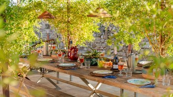 Mit seiner nach Westen ausgerichteten Terrasse, die die goldenen Farbtöne des Sonnenuntergangs genießt, und fabelhaft für das Leben im Freien eingerichtet, verbindet dieses elegante Steinhaus, das privat an einen Eichenwald angrenzt, traditionelle Materialien mit sehr individuellem Dekor und stilvollen farbenfrohen Akzenten. Dessen luftige und elegante sterngewölbte Wohnzimmer und der Essbereich fangen die kühlende Brise ein und der Essbereich öffnet sich zur Terrasse und zum Portikus an der Vorder- und Rückseite der Villa. Auf der vorderen Terrasse gibt es reichlich Sitzgelegenheiten in der Sonne und schattige Plätze, ergänzt durch einen Essbereich im Freien. Der hintere möblierte Portikus blickt auf den Eichenwald. Alle fünf Schlafzimmer sind mit Flair im eleganten italienischen Stil mit farbenfrohen Stoffen eingerichtet, aber auch von einheitlicher Größe und Standard mit viel Stauraum, Klimaanlage und eigenem Duschbad. Zwei Schlafzimmer befinden sich im ersten Stock des Haupthauses, eines mit einer großen privaten Terrasse mit Blick auf den Pool, Eichenholz und die Landschaft. Denen anderen beiden befinden sich im Erdgeschoss und sind vom hinteren Portikus aus zugänglich.