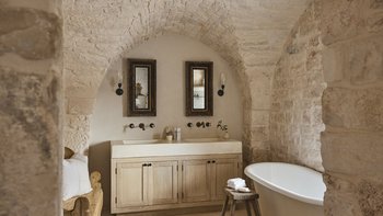 Wenn Sie die Masseria betreten, werden Sie sofort ein Gefühl der Glückseligkeit erleben. Dessen elegantes, traditionelles Steinfundament der Villa wirkt im Einklang mit der Fülle von natürlichem Licht, das durch das gesamte Anwesen fließt, um eine ruhige und behagliche Atmosphäre für die Gäste zu schaffen. Der Speisesaal im Innenbereich und die professionelle Küche laden zum Verwöhnen der Sinne ein und sind der perfekte Ort, um Geschichten zu teilen, Erinnerungen zu schaffen und einige unglaubliche lokale Gerichte zu genießen, die von Spitzenköchen im Haus zubereitet werden. Jedes der zehn Schlafzimmer mit eigenem Bad ist mit erstklassigem Komfort und charmanter Dekoration ausgestattet, wobei mehrere Zimmer auf die Terrasse hinausgehen, um das luftige Gefühl, das diese Villa so mühelos verkörpert, noch einmal zu wiederholen.