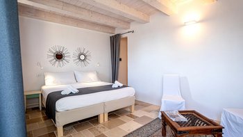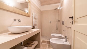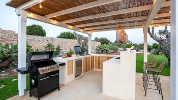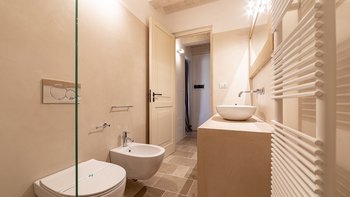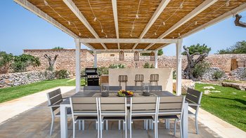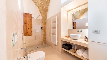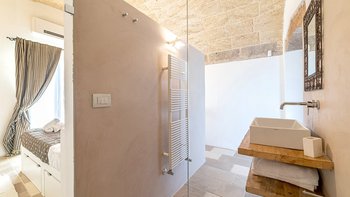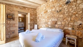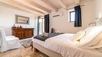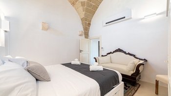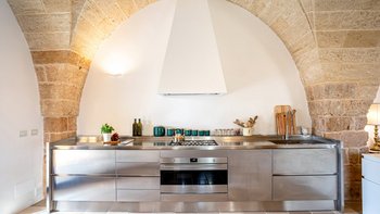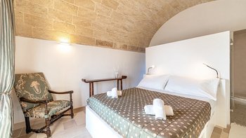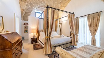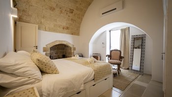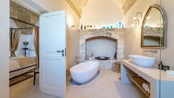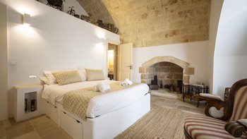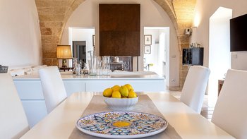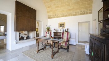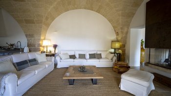 Im Inneren werden die Gäste von einem hellen und luftigen Interieur begrüßt, wo modernes Dekor und elegante Möbel eine anspruchsvolle und zugleich einladende Atmosphäre schaffen. Deren Hauptvilla verfügt über sechs wunderschön eingerichtete Schlafzimmer, von denen jedes auf einen malerischen Innenhof hinausgeht. Deren Herz der Masseria La Corte ist die moderne offene Küche und der Essbereich, der sich nahtlos an den Innenhof anschließt und einen perfekten Rahmen für Mahlzeiten im Innenhof oder Mahlzeiten im Freien unter dem Sternenhimmel schafft. Deren Wohnzimmer mit einem herrlichen Kamin an der Wand dient als zentraler Treffpunkt und strahlt Wärme und Eleganz in seinem modernen italienischen Stil aus.