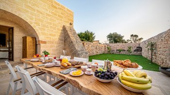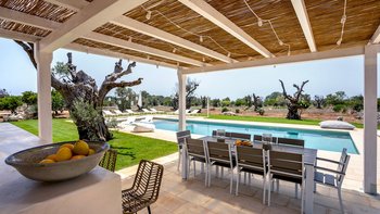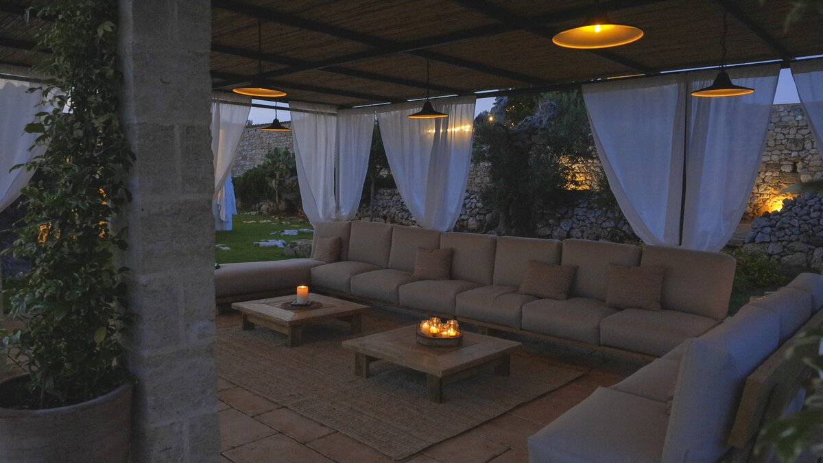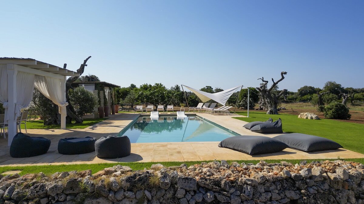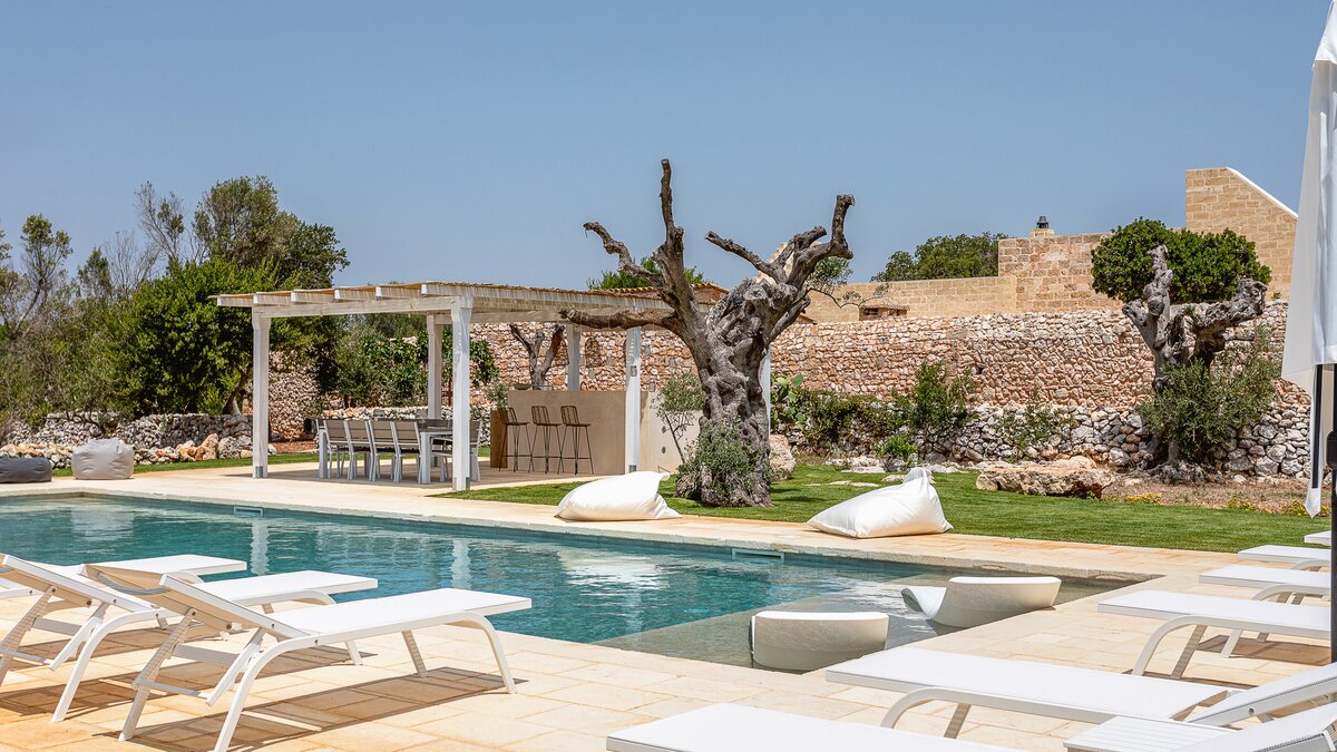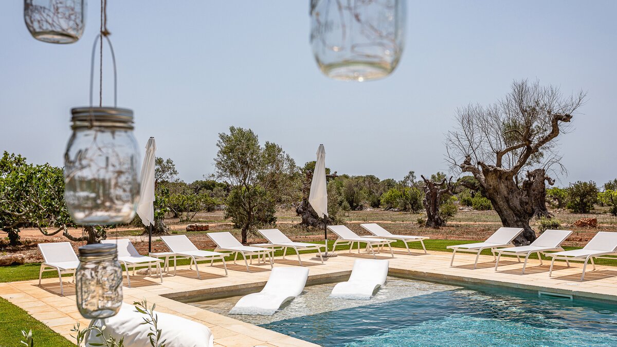 Die Masseria La Corte ist ein elegantes apulisches Bauernhaus mit sechs Schlafzimmern und einladenden Außenbereichen, nur etwas mehr als drei Kilometer von der Küste entfernt.