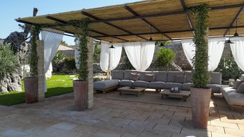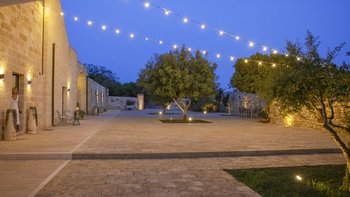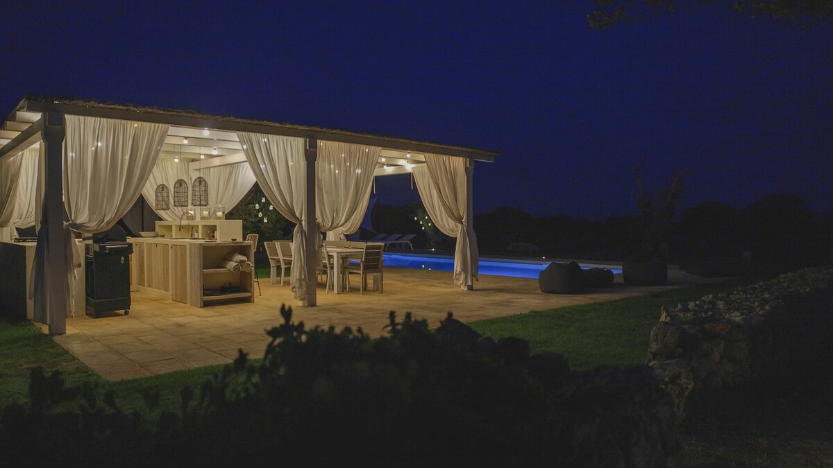 Bei Sonnenuntergang zeigt sich die Masseria La Corte von ihrer bezauberndsten Seite. Der weitläufige Innenhof mit seinen Zitronenbäumen und leuchtenden Blumen wird zu einer magischen Kulisse für Versammlungen im Freien, während der große Swimmingpool unter dem Abendhimmel glitzert. Denen Gäste können durch die Olivenhaine spazieren und die zeitlose Schönheit der Landschaft des Salento bestaunen oder einfach die Ruhe der Umgebung genießen. Nur wenige Kilometer vom charmanten Dorf Salve entfernt und in der Nähe der herrlichen Strände von Pescoluse, deren klares Wasser als die Malediven des Salento bekannt ist, bietet dieses idyllische Bauernhaus die perfekte Mischung aus Abgeschiedenheit und Erreichbarkeit, was es zu einem unvergesslichen Ausgangspunkt für die Erkundung der verborgenen Schätze Süditaliens macht.