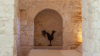 Mit einer Ansammlung von fünf Trulli-Kegeln, die das Haupthaus bilden, und einem modernen Nebengebäude mit vier Schlafzimmern direkt unterhalb der Poolterrasse ist diese entzückende Villa perfekt für Familientreffen. Auf dem ländlichen Grundstück eines privaten Anwesens, wo die Gäste auf gewundenen Wegen durch Felder zu Trulli-Ruinen folgen können, genießt das Haus eine außergewöhnliche Ruhe, umgeben von schönen abfallenden Rasenflächen mit Feigenbäumen und Blumenbänken, großen Terrassen mit schöner Aussicht und einem 16-Meter-Pool mit Hydromassagedüsen. Die Steinböden, Wände und Bögen des Trulli beherbergen zwei Schlafzimmer, zwei Sitzbereiche, eine voll ausgestattete, aber sehr ländliche Küche und ein Esszimmer, das sich zu einer überdachten Veranda öffnet, wo ein Grill und ein Pizzaofen die Mahlzeiten im Freien problemlos erledigen. Aller sechs Schlafzimmer haben einen externen Zugang und ein eigenes Bad mit Dusche, und es gibt eine Klimaanlage in der gesamten Villa, und Plasma-Fernseher sowohl im Trullo und auch im Nebengebäude. Trulli Ferragosto ist eine Mischung aus Charme der alten Welt und modernem Komfort und liegt in der Nähe von Stränden und mehreren hübschen Städten und 7 km von Geschäften und Restaurants in Ceglie Messapica entfernt.