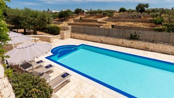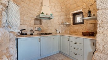 Die fünfkegelige Dachlinie dieser Familienvilla erhebt sich zwischen Obstbäumen und blühenden Sträuchern. In den Hang eines sanften Hügels getreten, wurde das Haus geschickt entworfen, um den Innenraum zu maximieren und gleichzeitig Komfort und Charakter zu vereinen. So werden Sitzecken, in dem kühlen Steinkegel und unter architektonischen Bögen, von Satellitenfernsehen und WLAN bedient; Eine wunderbar rustikale Küche / Esszimmer ist komplett mit modernen Einrichtungen ausgestattet, behält aber immer noch das Aussehen der traditionellen „Trulli“ und drei hübsche Schlafzimmer, mit schmiedeeisernen und bemalten Holzmöbeln, sind mit Klimaanlage gekühlt. Eines geräumige Hauptterrasse fügt einen Wohnbereich im Freien mit einem Vorhang-Esspavillon und einem sonnigen Sitzbereich hinzu. Und eine Steintreppe führt von hier auf die untere Terrasse, wo sich Liegen an einem großen Pool mit erfrischenden Hydromassagedüsen aufstellen. Dessen entspannende Tempo könnte mit einem Kochservice (im Voraus buchbar) verbessert werden, obwohl es einen Grill auf dem Grundstück gibt und eine gute Auswahl an lokalen Geschäften und Restaurants in 700 bis 900 Metern Entfernung zu Fuß erreichbar sind. Innerhalb des UNESCO-Weltkulturerbes liegt die Villa 3 km von Alberobello und 22 km vom Strand Torre Canne entfernt.