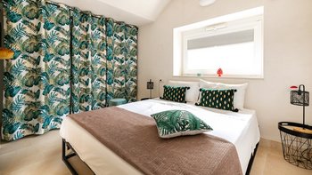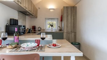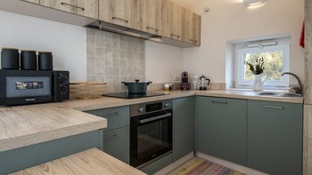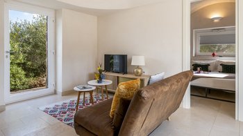 Im Inneren können die Gäste die OFFENER GRUNDRISS Küche, den Ess- und den Wohnbereich nutzen. Mit viel Tageslicht und modernen, eleganten Möbeln bietet dieser Bereich eine entspannte und beruhigende Atmosphäre. Mit großen französischen Türen, die sich zum Außenbereich öffnen, kann ein nahtloses Leben im Innen- und Außenbereich genossen werden. Weiters in der Villa gibt es ein Schlafzimmer mit Doppelbett, einen großen Kleiderschrank und ein Duschbad.