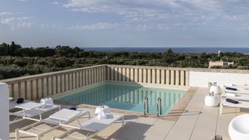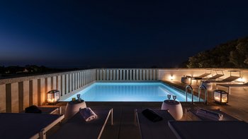 Der Pool befindet sich auf einer sonnigen Dachterrasse mit atemberaubendem Blick auf die Adria, umgeben von bequemen Liegen und stilvollen Sitzgelegenheiten, Dusche und Minikühlschrank. Unterhalb von Gewürzpflanzen und Obstbäumen sorgen für Farbe und Duft der Saison, während der private Wald und die umliegenden alten Olivenbäume ruhige Ecken zum Entspannen bieten.