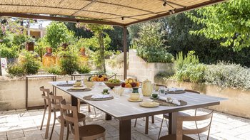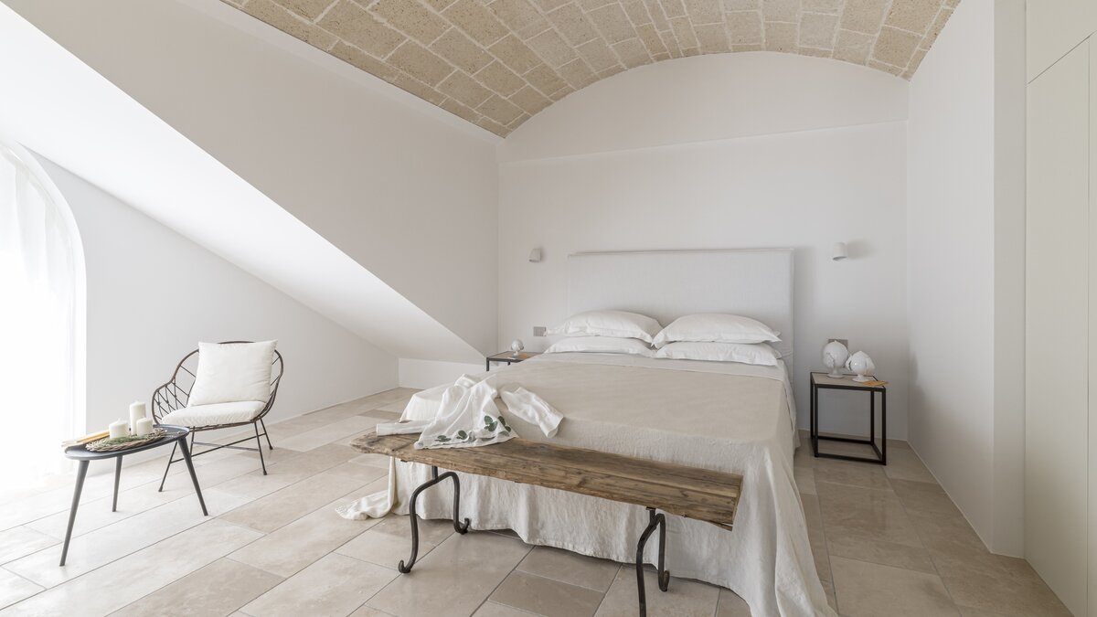 Das Haupthaus verfügt über vier Schlafzimmer mit eigenem Bad, jedes mit Kingsize-Betten und direktem Zugang zum Garten. Ein restaurierter Trullo-Anbau bietet ein weiteres Schlafzimmer mit Wohnbereich, Kamin und privatem Innenhof, ideal für Familien oder kleine Gruppen, die mehr Privatsphäre wünschen.
