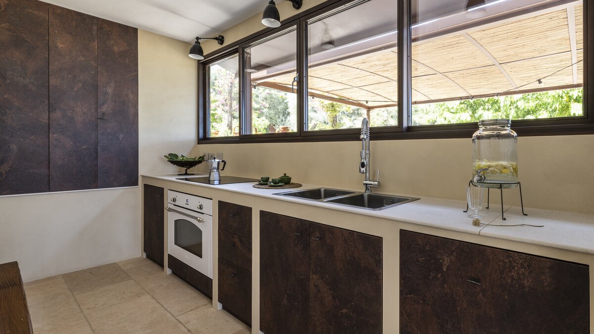 Die Innenräume sind hell und luftig, mit weißen Tuffsteinwänden, hohen Decken und sorgfältig durchdachten Möbeln. Vom Wohn- und Essbereich gelangen Sie auf Terrassen mit Blick auf die Adria, während die voll ausgestattete Küche mit einem Essplatz im Freien verbunden ist, sodass Sie sich mühelos zwischen drinnen und draußen bewegen können.
