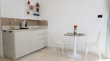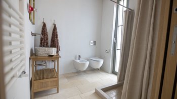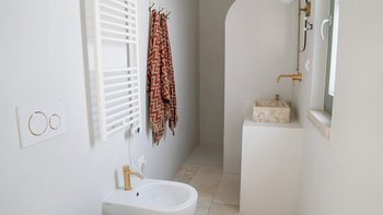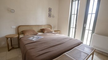 Nur wenige Schritte entfernt befindet sich das stilvolle Gästehaus mit einem Schlafzimmer und originalen Gewölbedecken, einem schicken Wohnbereich mit Bobochic-Sofa, einer kompakten, aber gut gestalteten Kücheneinrichtung, ideal für schnelle Erfrischungen am Pool und einem eleganten Duschraum mit Waschgelegenheiten. Eine schattige Pergola mit Blick auf den Pool ist ideal für einen morgendlichen Kaffee oder ein Aperitivi am Abend.