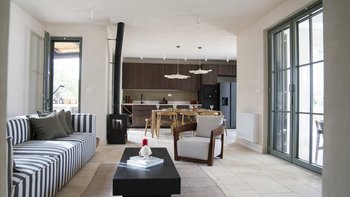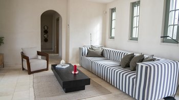 Die Hauptvilla verfügt über drei wunderschön gestaltete Schlafzimmer mit luxuriösen Badezimmern in Marmor und Naturstein. Zwei der Zimmer können als Doppel- oder Zweibettzimmer eingerichtet werden, ideal für eine Reihe von Gruppenkonfigurationen. Ein geräumiger offener Wohnbereich öffnet sich direkt auf die Poolterrasse, während die moderne Küche komplett ausgestattet ist für entspannte Familienmahlzeiten oder formellere Abendessen. Denen Innenräume verbinden lokale Materialien und handwerkliche Elemente mit modernem Komfort wie Klimaanlage, Highspeed-WLAN und Smart-TV-Unterhaltung.