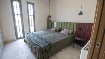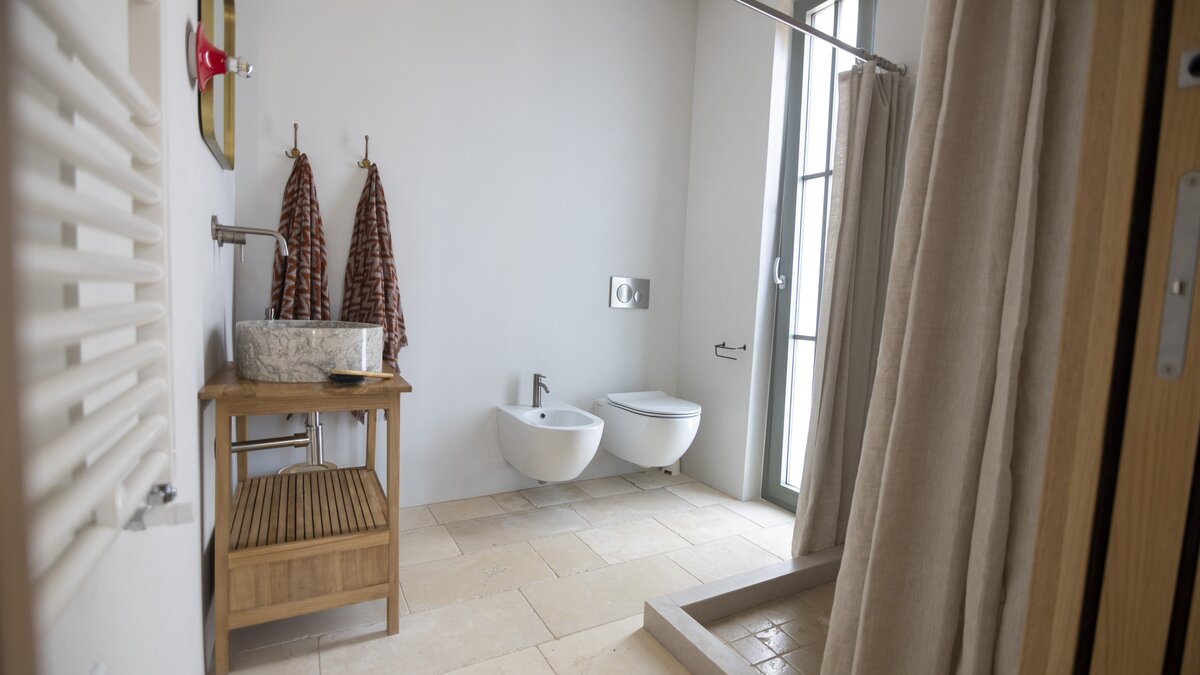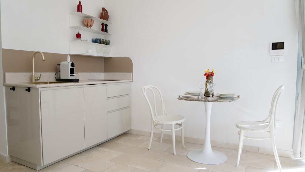 Nur ein paar Schritte entfernt befindet sich die Pool Suite, ein stilvolles Gästehaus mit einem Schlafzimmer, das seine ursprünglichen Gewölbedecken beibehält. Es verfügt über einen schicken Wohnbereich, eine kompakte, aber voll ausgestattete Küche, die sich ideal für schnelle Erfrischungen am Pool eignet, und ein hochwertiges Bad mit ebenerdiger Dusche und Wäschemöglichkeiten. Eine schattige Pergola mit Blick auf den Pool lädt zu morgendlichem Kaffee oder zu abendlichen Aperitivi ein.