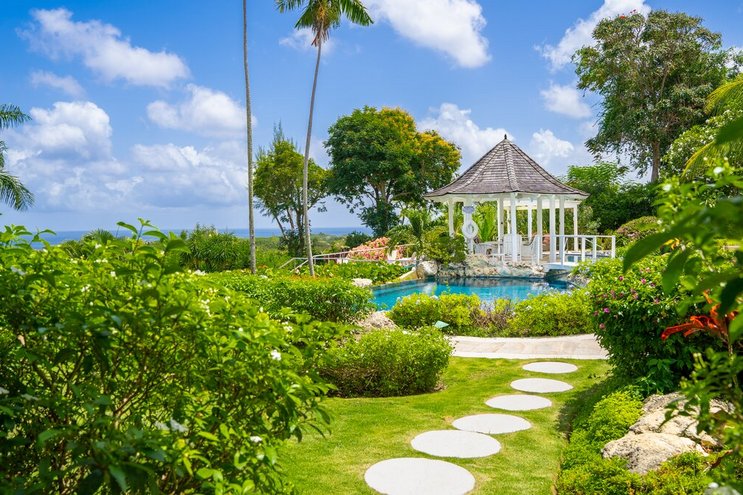 Durch eine Lücke in den Bäumen blickt man auf das Blaue der Karibik und die Aussicht vom außergewöhnlichen Poolgarten ist verlockend. Des Hauses, anmutig und charmant, ist ein tropischer Schatz.