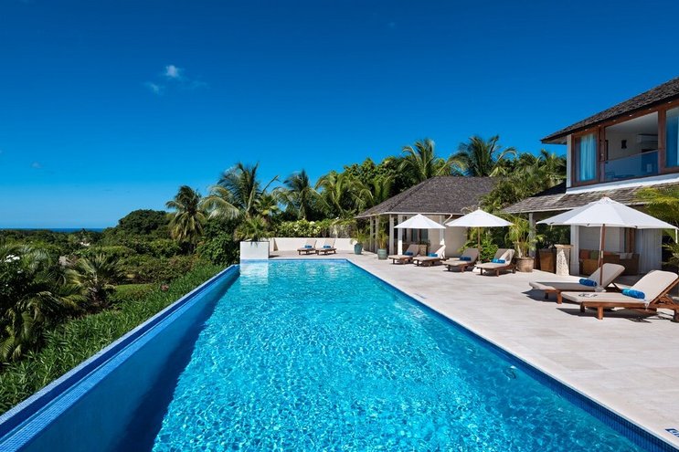 An einem wunderschönen, glitzernden Sandstrand treffen die Gärten dieser Luxusvilla auf den weitläufigen Gibbs Beach. Der Blick von der außergewöhnlichen Poolterrasse ist atemberaubend.