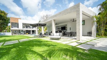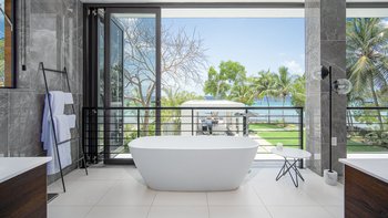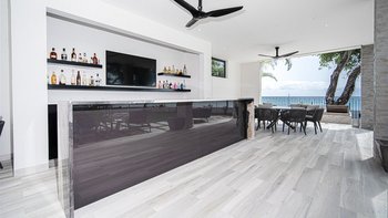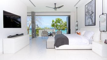 Mit raumhohen Fenstern, die die Aussicht bewundern, eignet sich das makellos gestaltete Onyx für ein OFFENER GRUNDRISS Wohnen mit einem komfortablen Sitzbereich, einem Essbereich im Innenbereich und einer voll ausgestatteten modernen Küche mit schönen Marmor-Arbeitsplatten, die alle in kühlen Grautönen gehalten sind. Es gibt fünf fantastische Schlafzimmer mit Bad, darunter die Master-Suite, mit eigenem freistehenden Bad mit Blick auf das Meer. Ein ausgezeichnetes Team von Mitarbeitern umfasst einen Koch, einen Butler, eine Wäscherei und einen Reinigungsdienst an sechs Tagen in der Woche, damit sich die Gäste wirklich entspannen können.