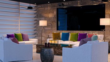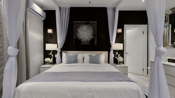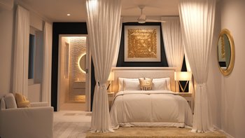 Beim Betreten der Villa ist das Gefühl von Erhabenheit unübersehbar. Dessen Interieur wurde von der renommierten Innenarchitektin Celia Sawyer entworfen. Freuen Sie sich auf anspruchsvolle Räumlichkeiten im Ibiza-Stil mit modernen, stromlinienförmigen Möbeln, hochwertigen Betten und neutralen Farbtönen, die eine entspannte und raffinierte Atmosphäre für die Gäste schaffen, die allesamt eine helle und luftige Atmosphäre beibehalten. Deren Küche ist geräumig und voll ausgestattet mit High-End-Geräten, ideal für begeisterte Köche oder diejenigen, die einen Kochservice in der Villa mieten möchten. Dieser Raum ist auch mit einer überdachten Außenterrasse verbunden, die den perfekten Rahmen für Mahlzeiten im Freien bietet. Deren Villa bietet auch vollklimatisierte Räume, wie das Home-Fitnessstudio, um den hohen Temperaturen entgegenzuwirken, die das ganze Jahr über auftreten. Jedes der Schlafzimmer der Villa ist klimatisiert und verfügt über ein eigenes Bad, während zwei der Zimmer auch über einen begehbaren Kleiderschrank verfügen und auf eine große überdachte Terrasse mit Meerblick führen.