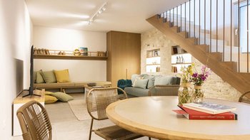 Auf der Eingangsebene geht ein offener Wohn- und Essbereich in eine voll ausgestattete Küche über, die sich auf eine schattige Terrasse öffnet, die ideal für lange, gemütliche Mahlzeiten ist. Zwei Doppelschlafzimmer mit eigenem Bad vervollständigen diese Etage.