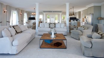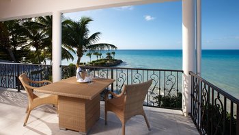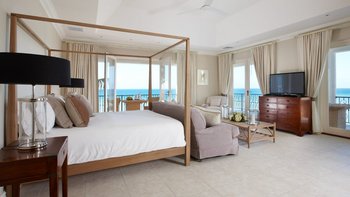 Im Obergeschoss befinden sich zwei weitere Doppel-Kingsize-Schlafzimmer mit Bad en Suite. Mit vier Himmelbetten, einem neutralen, beruhigenden Interieur und französischen Türen, die auf einen Sitzbalkon mit Meerblick führen, sind diese Zimmer der Inbegriff von Luxus.