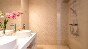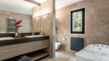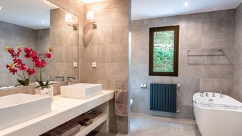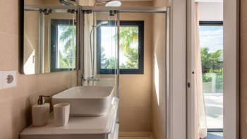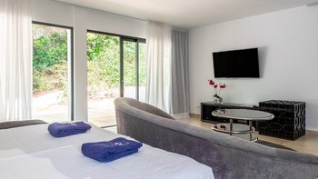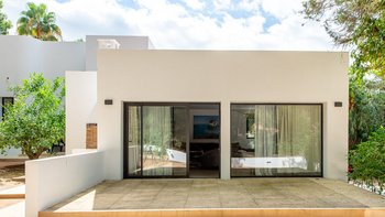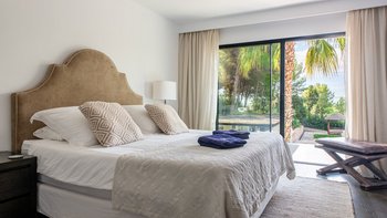 Die Liebe zum Detail macht dieses Haus zu einem sehr angenehmen, komplett renovierten Zuhause; Die Schlafzimmer und Bäder sind alle neu und außergewöhnlich groß für Ibiza-Verhältnisse. Deren Küche, die ebenfalls brandneu ist, ist mit allem ausgestattet, um jeden Tag für kleine und große Gruppen kochen zu können. Es gibt insgesamt 3 Wohnzimmerbereiche im Haus, so dass es auch für große Gruppen sehr einfach ist, Privatsphäre zu finden oder Zeit miteinander zu verbringen. Der Haupthaus hat zwei Stockwerke. Im sehr hellen Erdgeschoss befindet sich die Küche mit einem angeschlossenen großen Essbereich, 2 Wohnzimmer mit Sofas, die Platz für 10 Personen bieten. Einer von ihnen ist auch mit einem Smart-TV ausgestattet. Auf der anderen Seite des Wohnzimmers befindet sich ein großes Schlafzimmer mit separatem Bad, das eine Badewanne und eine ebenerdige Dusche bietet. Im ersten Stock befindet sich ein weiteres Wohnzimmer – mit einem herrlichen Blick auf das Anwesen und Ibiza-Stadt mit dem Schloss von Ibiza im Hintergrund. An einem klaren Tag kann man sogar Formentera sehen. Auf der linken Seite gelangt man in ein großes Schlafzimmer mit eigenem Bad, mit Badewanne und separater Dusch- und begehbarem Kleiderschrank. Auf der rechten Seite befinden sich zwei weitere Schlafzimmer mit eigenem Bad, jeweils mit begehbaren Duschen. Beiden Schlafzimmer teilen sich eine große Terrasse, die mit einem motorisierten Schiebedach überdacht werden kann. Von dort aus kann man auch Ibiza-Stadt sehen und einen Blick auf das Meer werfen. Das Gästehaus, intern durch einen separaten Eingang verbunden, besteht aus einem sehr großen Zimmer mit einem Doppelbett und einer Sitzecke, einem Bad mit Dusche und direktem Zugang zum Garten.