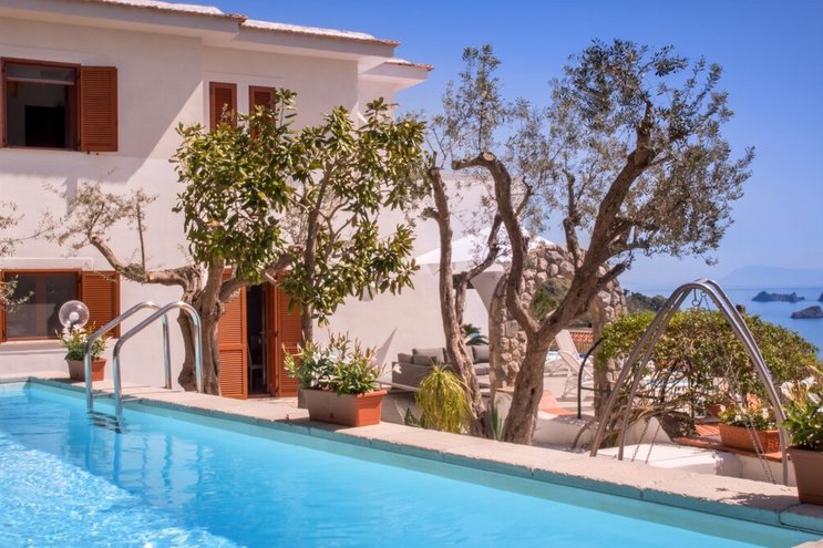 Die Villa Sirenuse mit atemberaubendem Meerblick liegt nur wenige Schritte von den Geschäften und Restaurants im Dorf Colli di Fontanelle entfernt.