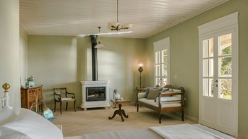Draußen gibt es eine geräumige Veranda mit Blick auf den Privater Pool, ideal für Mahlzeiten im Freien unter der Sonne von Kefalonia. Der Poolbereich ist von üppigen Rasenflächen und Olivenhainen umgeben. Obwohl die Villa wunderbar abgeschieden erscheint, sind eine lokale Taverne und ein Geschäft nur einen Spaziergang entfernt.