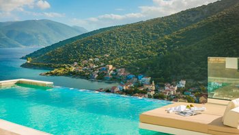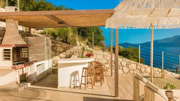 Draußen verfügt der private Infinity-Pool über eine bezaubernde Glaswand und einen angrenzenden Außenloungebereich mit Blick auf das Meer, wodurch eine nahtlose Verbindung zwischen dem Wasser und dem Horizont geschaffen wird. Tauchen Sie ein in das erfrischende Wasser oder sonnen Sie sich auf den bequemen Sonnenliegen der Poolterrasse. Genießen Sie köstliche Mahlzeiten im Freien in der überdachten Außenbar und dem Grillbereich, während Sie die sanfte Meeresbrise genießen. Deren Villa bietet einen bequemen Zugang zu lokalen Geschäften, Restaurants und dem malerischen Dorf Agia Efimia, das für seinen ruhigen Hafen und die charmante dörfliche Atmosphäre bekannt ist. Denen Gäste können bequem mehrere historische Sehenswürdigkeiten und Naturwunder in der Nähe sowie Strände wie das nur zwei Kilometer entfernte Lithovatis Agia Efimia erkunden.