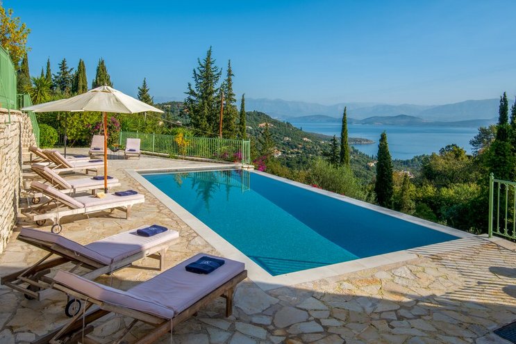Mit herrlichem Blick auf die Hügel und den Hafen darunter, ist dies eine moderne und stilvolle Luxusvilla auf Korfu, gut gelegen für mehrere Strände und Buchten, und inklusive Kochservice für mühelose Freizeit.