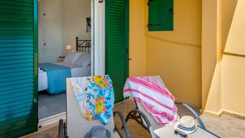 Mit einem herrlichen Blick auf das Meer und die Berge des Festlands vom Balkon in der obersten Etage ist dies ein romantischer Rückzugsort für zwei, die den Pool und die Gärten des hübschen Kasomitria-Gebäudes genießen.