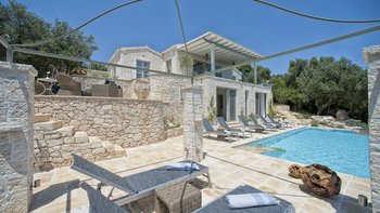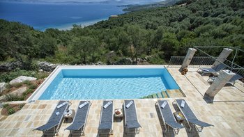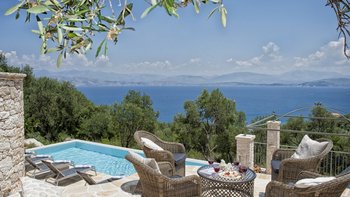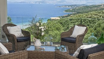 Als eines von fünf stilvollen Häusern, die sich ein privates und ruhiges Anwesen teilen, bietet diese Luxusvilla auf Korfu einen herrlichen Meerblick und einfachen Zugang zu einer Reihe von beliebten Resorts.