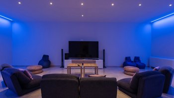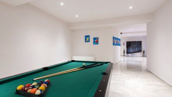 Ein zusätzlicher Hauch von Luxus auf dieser Etage ist ein großer Medienraum mit 75-Zoll-Fernseher, PlayStation und Billardtisch, der sicherlich bei Teenagern beliebt ist. Wenn es um die Lage geht