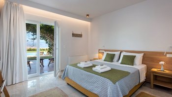 Gartentor öffnet sich zum wunderschönen goldenen Sandstrand von Kalamaki, wo sanfte Regale perfekte Bedingungen für Familien mit Kindern bieten.