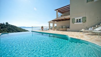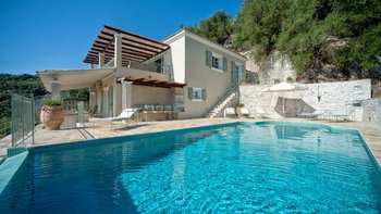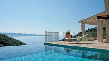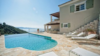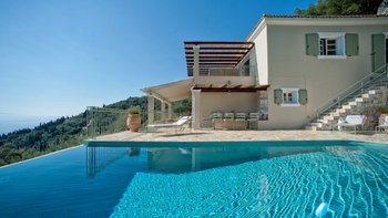 Große Tavernen, preiswerte Bootsverleihe und der hübsche kleine Kieselstrand bei Agni sind alle nur wenige Schritte von diesem klassischen Haus an der Nordostküste Korfus entfernt. Auf einem baumbestandenen Hügel gelegen, bietet Nicoletta einen atemberaubenden Blick auf das Ionische Meer – jeder Ort der Entspannung sonnt sich in der Aussicht, aber sie sind besonders durch den Infinity-Pool und die umliegende Terrasse gekennzeichnet. Dieses Drei-Bett-Haus hat einen entspannten Charme, der Sie sofort in eine einladende Atmosphäre wie zu Hause einhüllt. Dessen Haus wurde in einem modernen korfiotischen Design erbaut und nutzt das natürliche Licht der Insel mit geräumigen Innenräumen, klassisch weißem Dekor und großen französischen Fenstern, die die Aussicht genießen. Malerische apfelgrüne Fensterläden tragen zusammen mit der mit Stein übersäten Poolterrasse und wunderschönen überdachten Terrassen zum Charme des Äußeren bei.