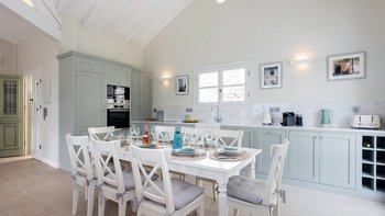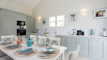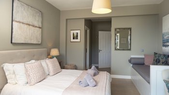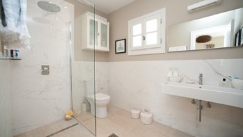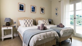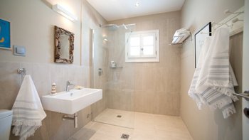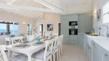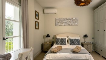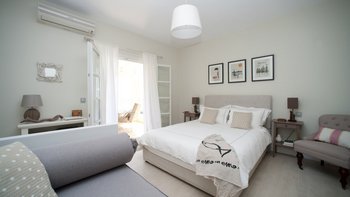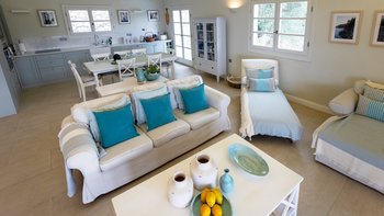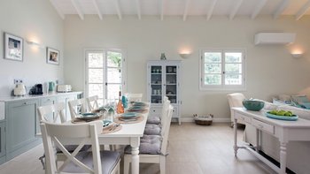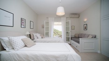 Der Eingang der Villa befindet sich im Erdgeschoss und führt in das große Wohnzimmer, den Essbereich und die Küche. Dieser offene Raumaufteilung verleiht der Villa ein großzügiges Ambiente, das durch den Blick auf das Meer und die angrenzende möblierte Terrasse noch besser wird. Der Wohnbereich mit Weißfokus wurde stilvoll in beruhigenden Aqua-, Grau- und Weißtönen eingerichtet, und es gibt einen großen Esstisch für 8 Personen. Dessen neu installierte und gut ausgestattete Küche ist handbemalt in Farrow und Ball hellblau und ergänzt das stilvolle Wohninterieur mit einer hellen Quarz-Arbeitsplatte und neuen, hochwertigen Geräten. Ein großzügiges Schlafzimmer mit Doppelbett vervollständigt das Erdgeschoss und verfügt über einen großen Kleiderschrank, eine stilvolle Chaiselongue und ein luxuriös begehbares Duschbad. Denen Türen vom Schlafzimmer führen auch auf die Terrasse am Meer. Eine Treppe führt hinunter in das untere Erdgeschoss der Villa, wo sich zwei weitere geräumige Schlafzimmer befinden. Dessen großes, in elegant neutralen Farbtönen gehaltenes Doppelzimmer verfügt über ein eigenes Bad mit Dusche, während das großzügige Zweibett-Schlafzimmer über ein eigenes Bad und ein zusätzliches Schlafsofa (nur für Kinder) verfügt. Beiden Zimmer sind wunderschön gestaltet, mit französischen Fenstern, die auf die Poolterrasse der Villa führen. Aller drei Schlafzimmer bieten einen atemberaubenden Meerblick.